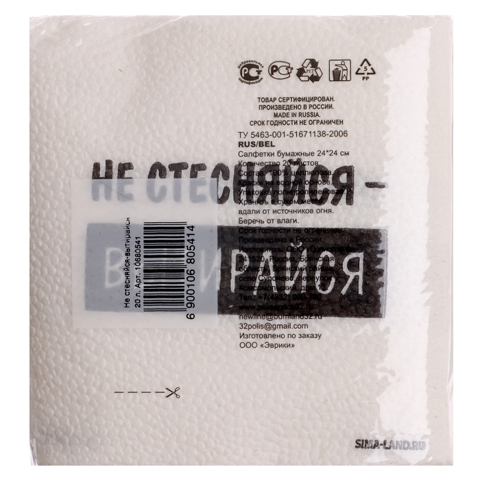 Салфетки бумажные однослойные "Не стесняйся-вытирайся", 24х24 см, набор 20 шт.