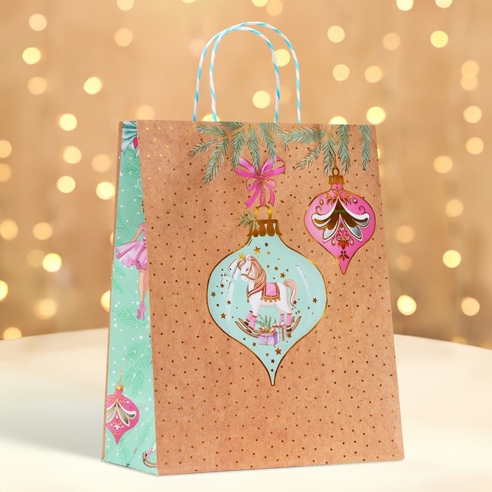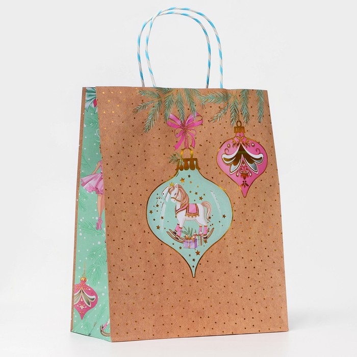 Новый год. Пакет бумажный подарочный новогодний крафт "Новогоднии игрушки" 26 х 32 х 12 см.