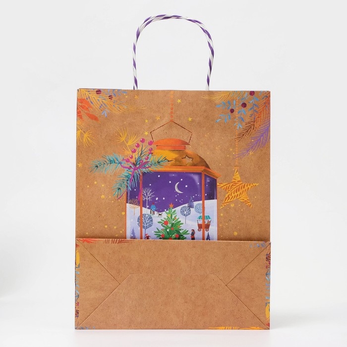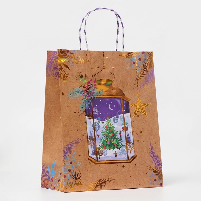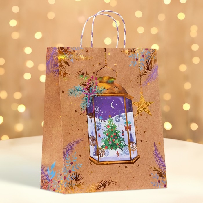 Новый год. Пакет бумажный подарочный новогодний крафт "Новогодняя лампа" 26 х 32 х 12 см.