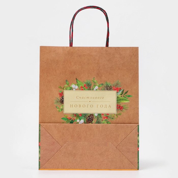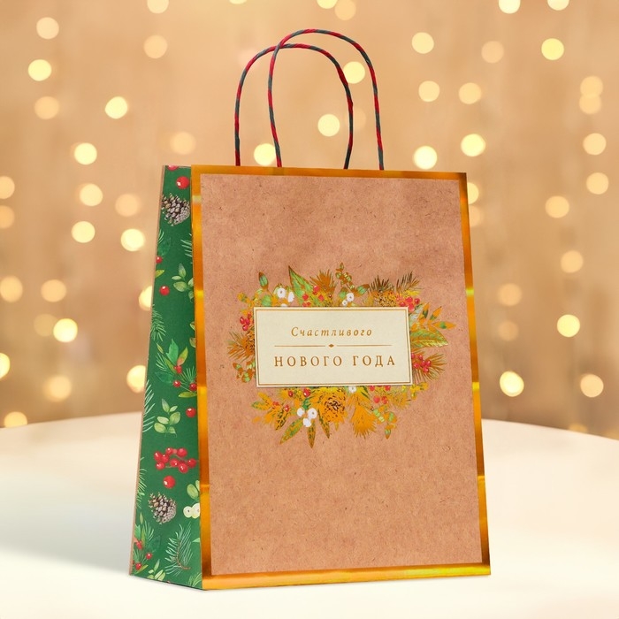 Новый год. Пакет бумажный подарочный новогодний крафт "Счастливого нового года" 18 х 22,3 х 10 см.