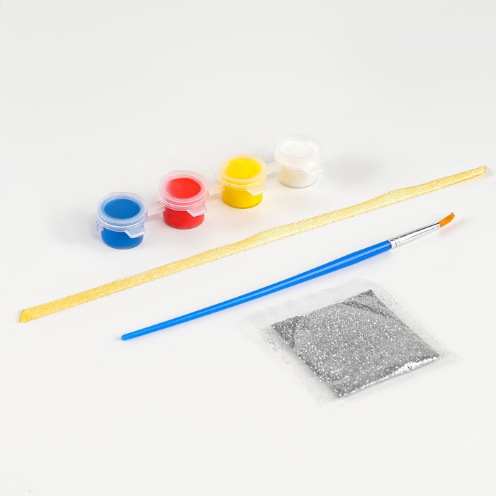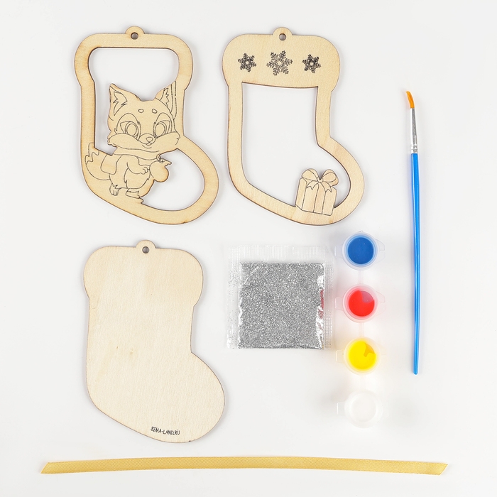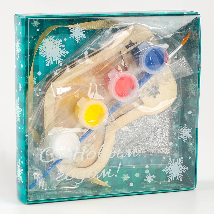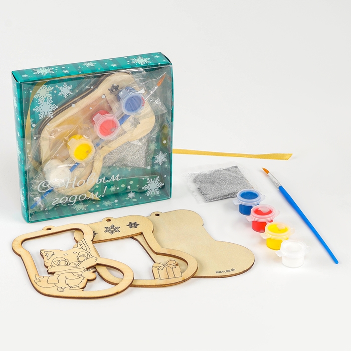- В комплект входят деревянные заготовки, краски и кисточка, блёстки и лента.