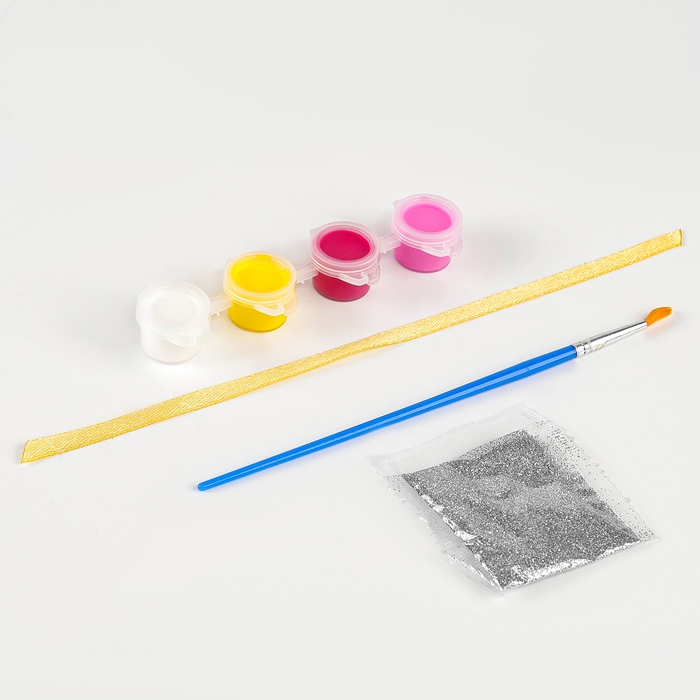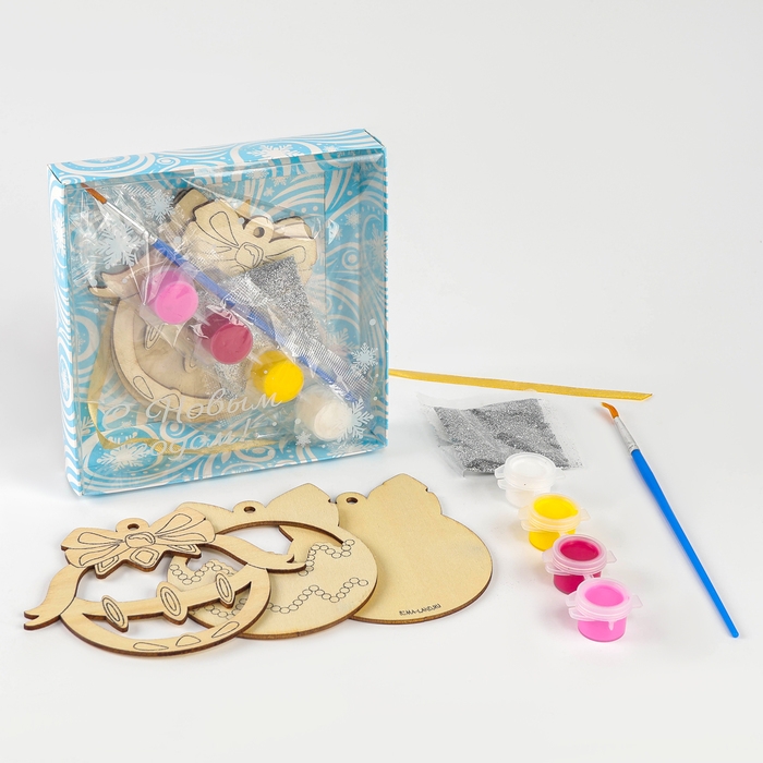 - В комплект входят деревянные заготовки, краски и кисточка, блёстки и лента.