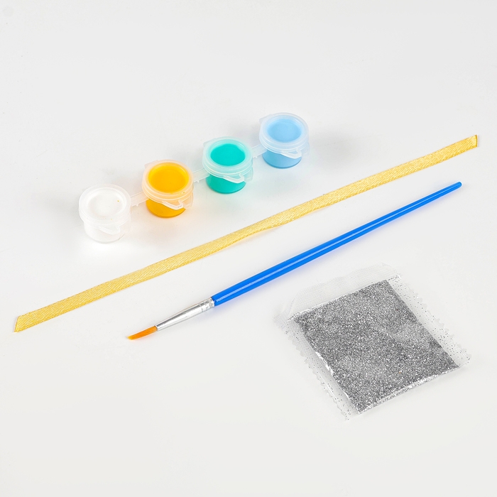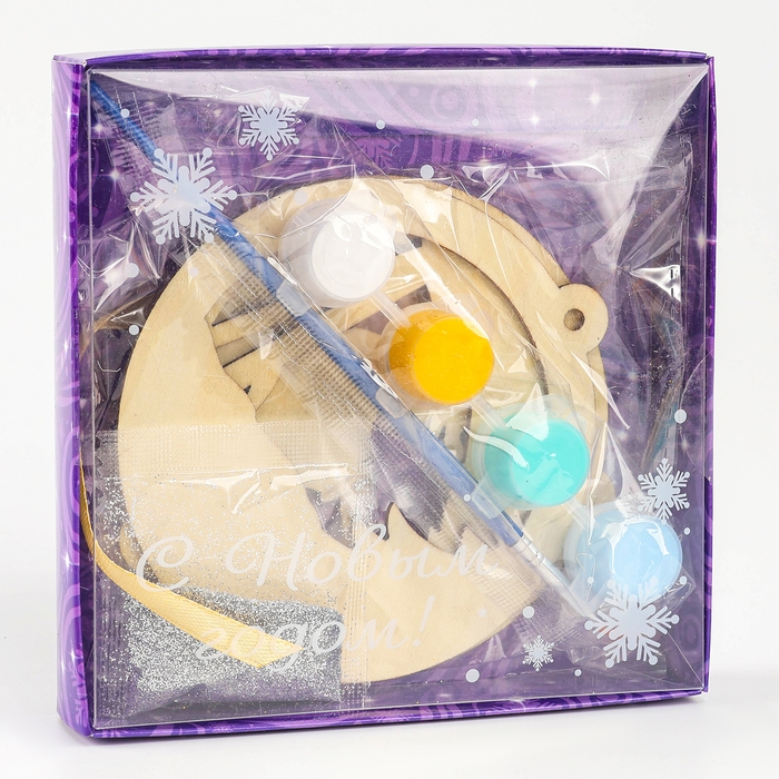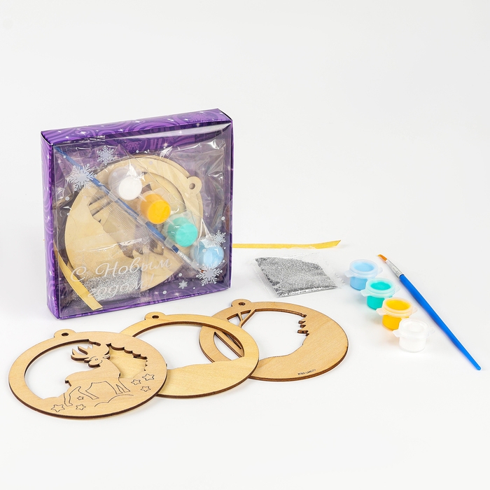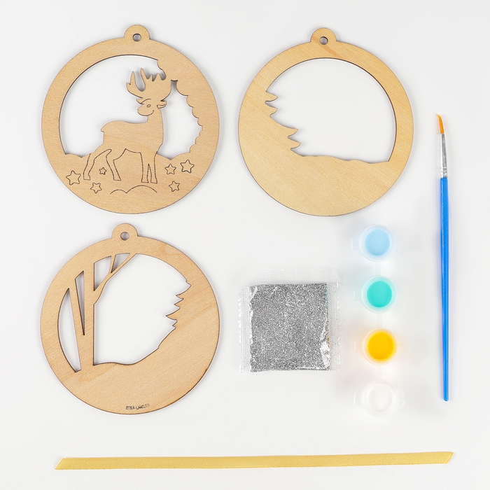 - В комплект входят деревянные заготовки, краски и кисточка, блёстки и лента.