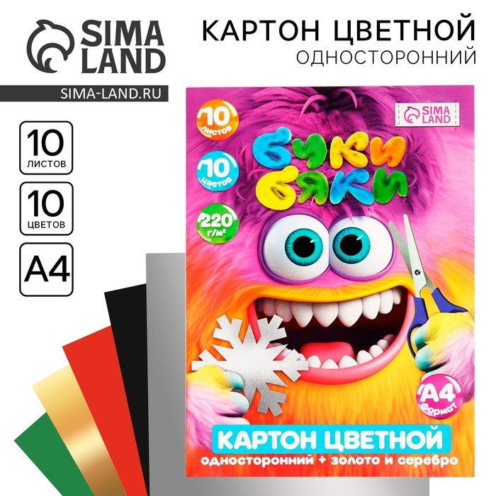 Картон цветной А4 мелованный 10л 10 цв 220г односторонний (золото и серебро) Буки Бяки