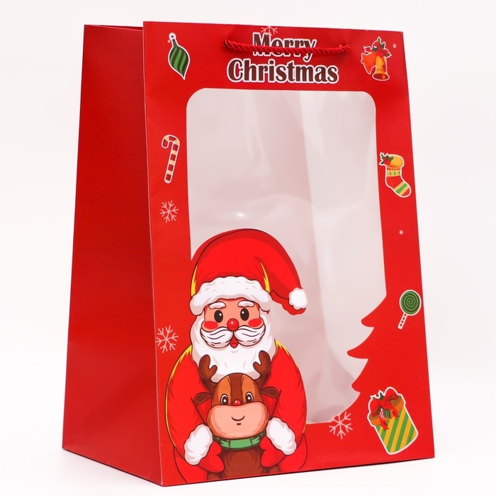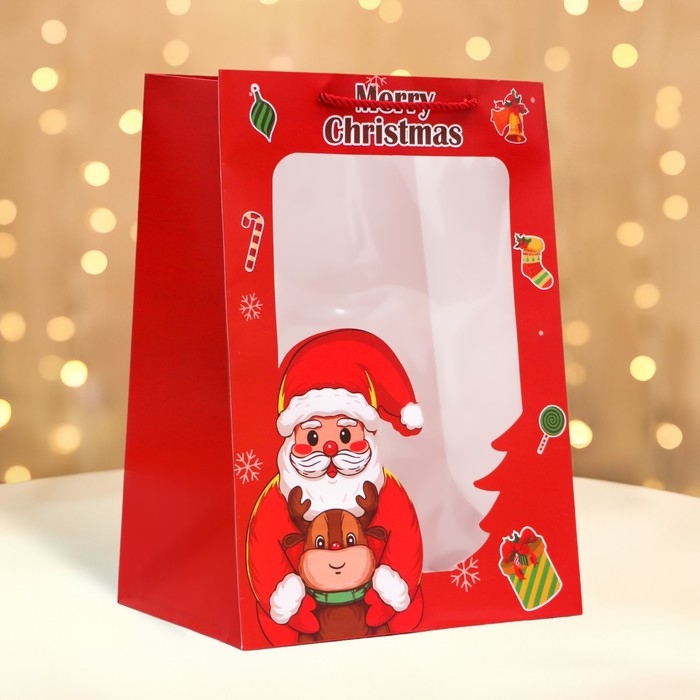 Пакет подарочный с окном новогодний имеет размеры 25 х 35 х 18 см. Он выполнен из высококачественного материала, который обеспечивает его прочность и долговечность.