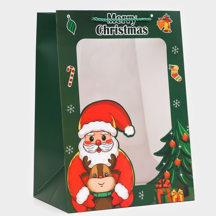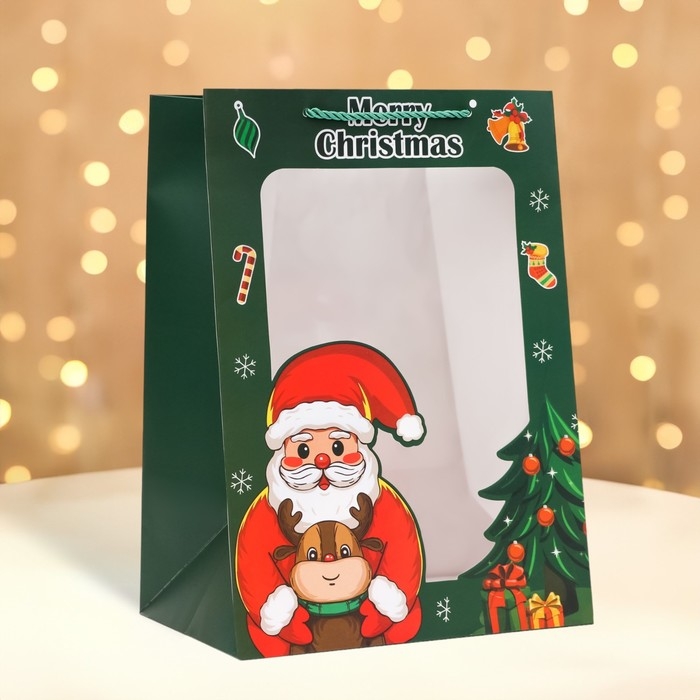 Пакет подарочный с окном новогодний имеет размеры 25 х 35 х 18 см. Он выполнен из высококачественного материала, который обеспечивает его прочность и долговечность.