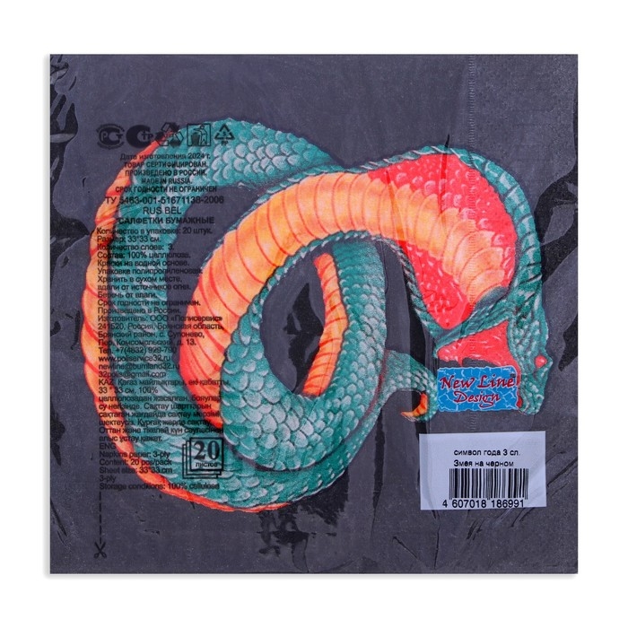 Новогодние салфетки бумажные New Line Design «Змея на чёрном» 3 слоя, 33х33 см, 20 шт