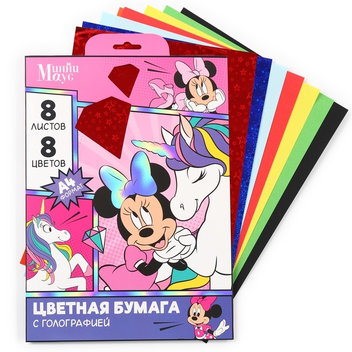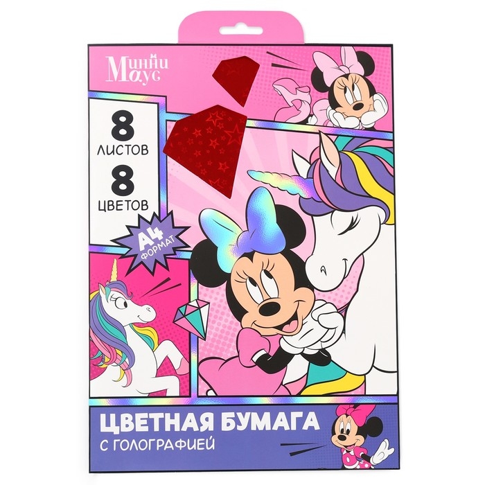 Набор цветной бумаги с голографией А4, 8 листов, 8 цветов, 80г/м2, Минни Маус и Единорог