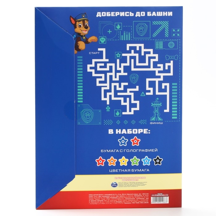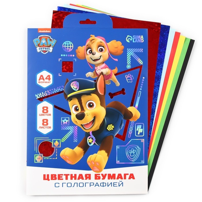 Набор цветной бумаги с голографией А4, 8 листов, 8 цветов, 80г/м2, Щенячий патруль