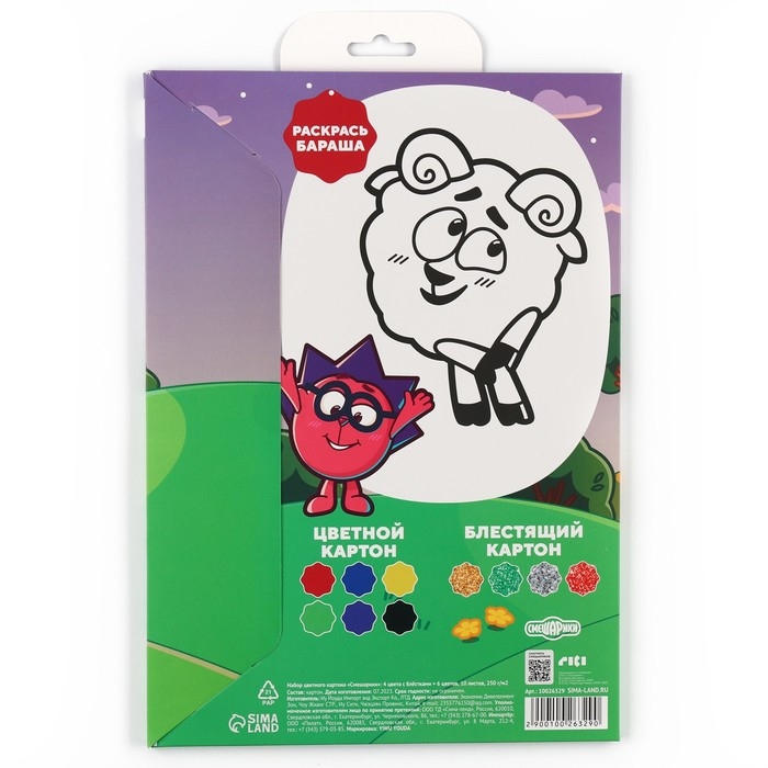 Картон цветной с блёстками, А4, 10 листов, 10 цветов, немелованный, двусторонний, в папке, 250 г/м², Смешарики
