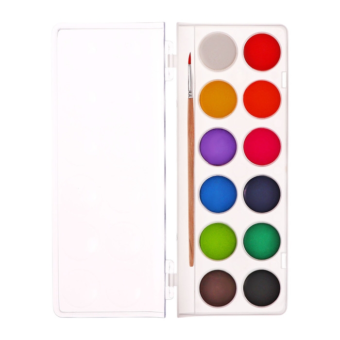 Краски акварельные 12 цветов, круглые, диаметр кюветы 28 мм, с кистью, пластиковый пенал, CALLIGRATA TOP