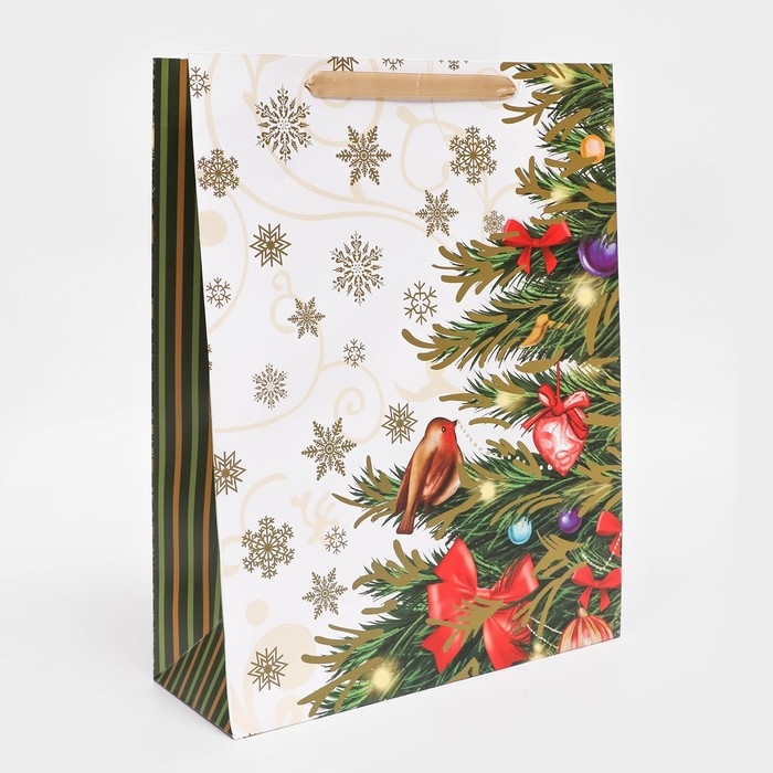 Подарочный пакет, ламинированный и новогодний, размером 31 х 40 х 11,5 см — это идеальный выбор для упаковки ваших праздничных сюрпризов. Этот пакет сочетает в себе практичность и элегантный дизайн, который украсит любой подарок и создаст особую атмосферу волшебства и радости.
