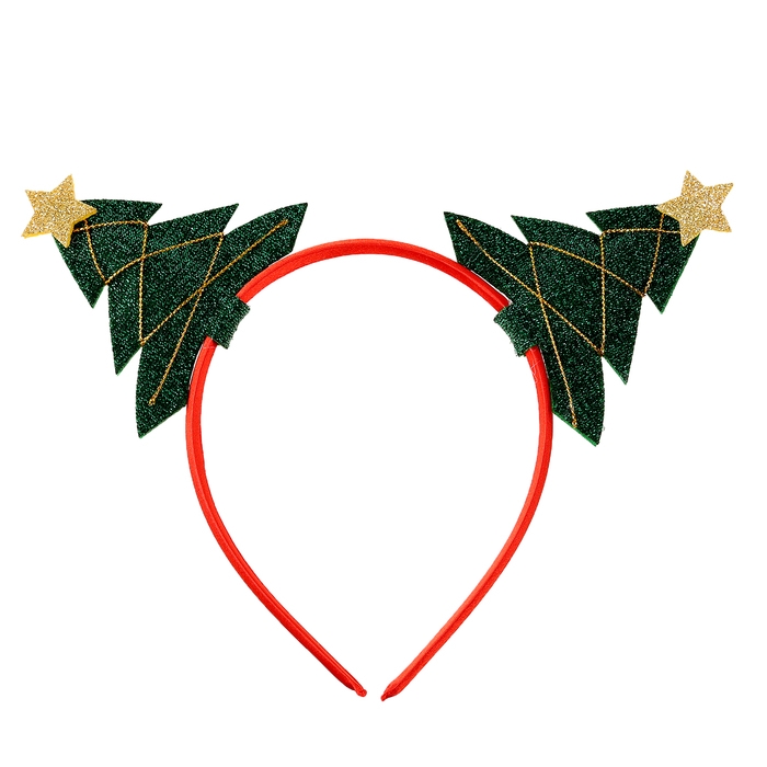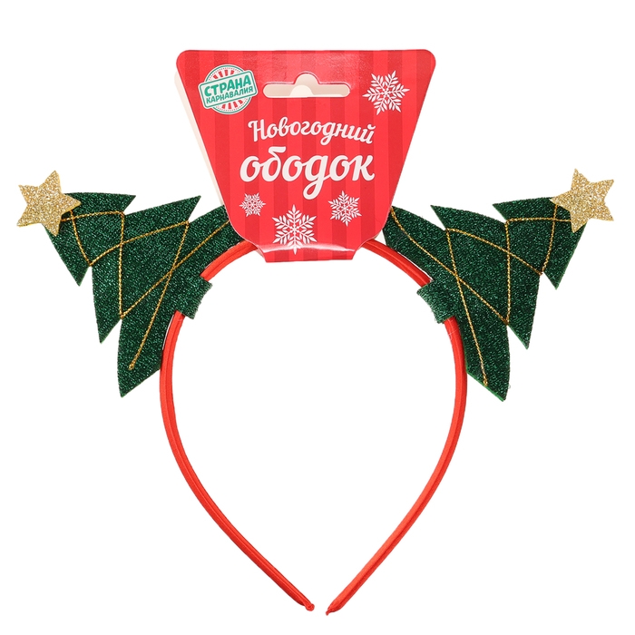 - Ободок украшен двумя объемными елочками, покрытыми блёстками. Елочки имеют классическую форму и украшены золотистыми блестками и звездами