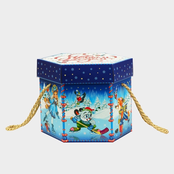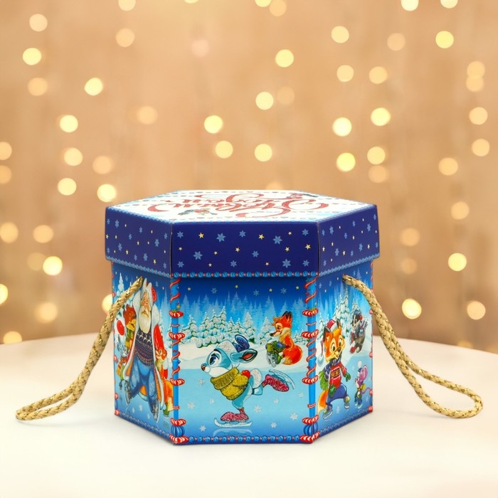 Новый год. Подарочная коробка новогодняя Шестигранник малый "Зимние забавы" с веревочными ручками, 210x210x185 мм.