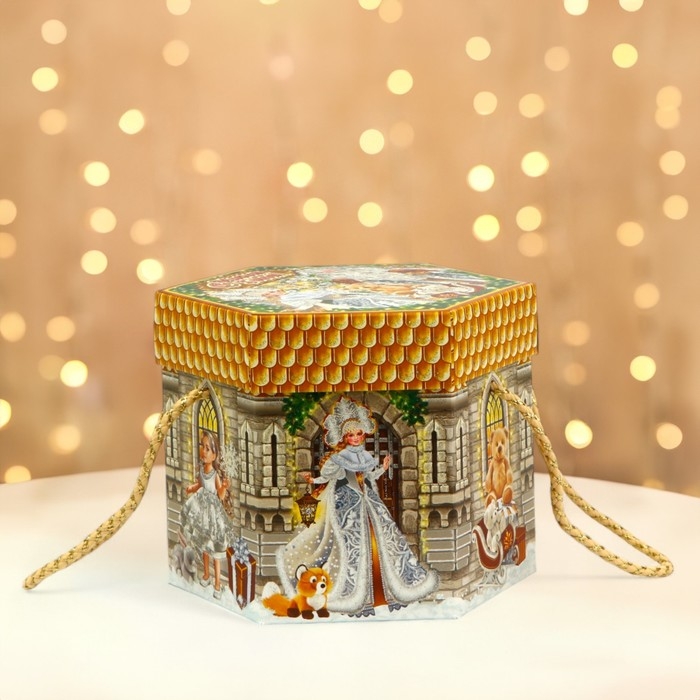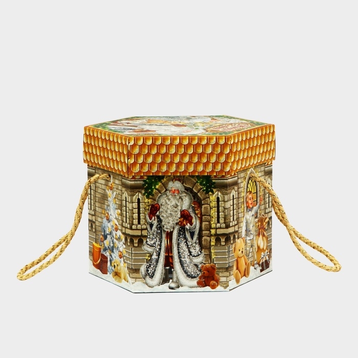 Новый год. Подарочная коробка новогодняя Шестигранник малый "Новогодний шарм" с веревочными ручками, 210x210x185 мм.