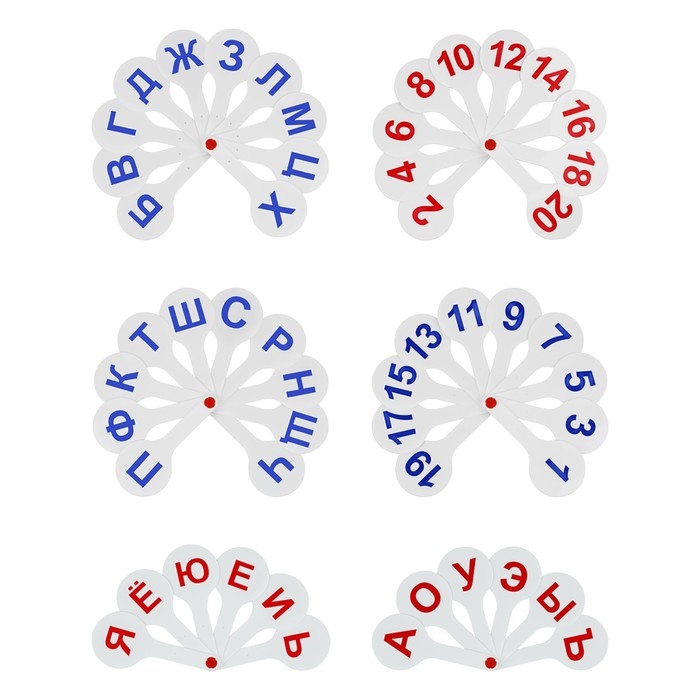 Набор содержит 3 веера с гласными и согласными буквами русского алфавита, а также цифрами. Символы нанесены с двух сторон. Крупный размер и шрифт, качественная печать, устойчив к истиранию. Изготовлен из сертифицированного плотного полипропилена. Размер в индивидуальной упаковке- 240 х 190 х 15 мм. Поставляется в пакете с европодвесом.