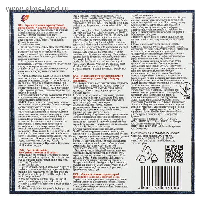Краска по ткани, набор 9 цветов х 15 мл, Луч, акриловая на водной основе