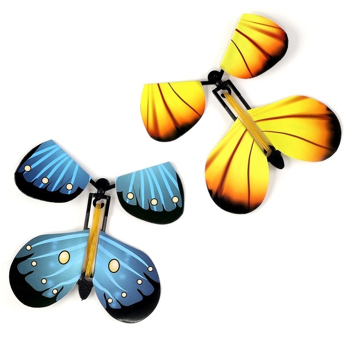 Натянутая резинка закручивается. Когда ты отпускаешь бабочку, то резинка быстро раскручивается, и бабочка летит.