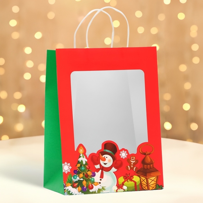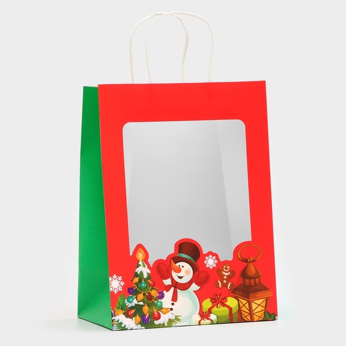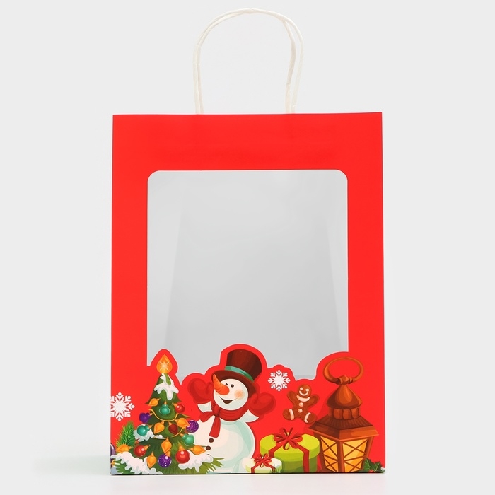 Пакет подарочный новогодний с окном "Снеговик"30 х 22 х 14 см.