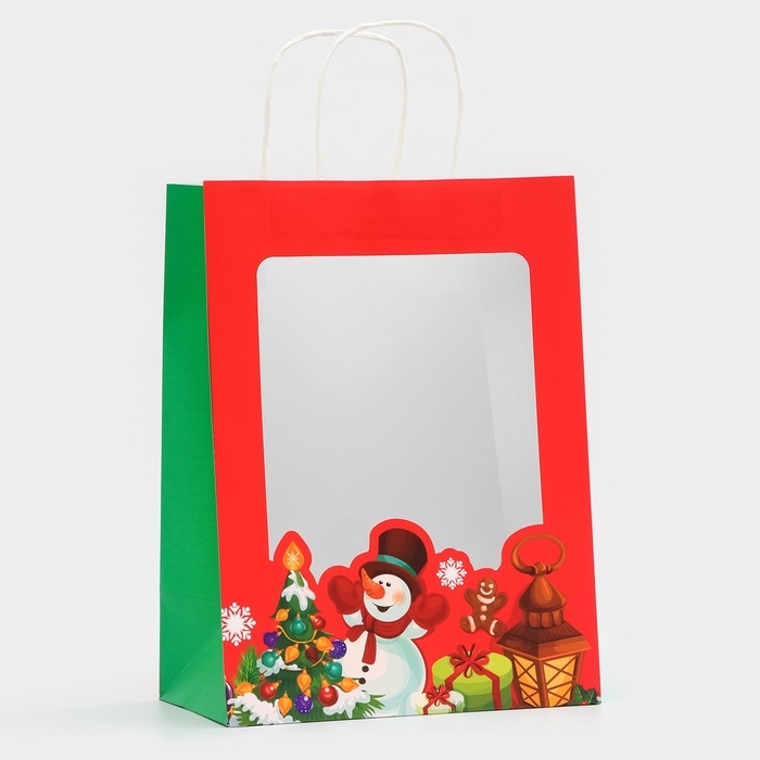 Пакет подарочный новогодний с окном "Снеговик" 26 х 35 х 16 см.