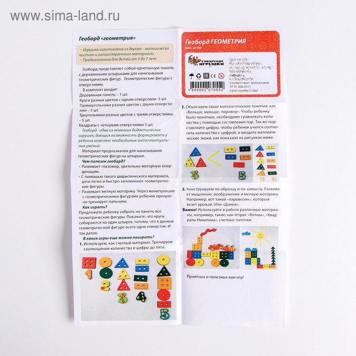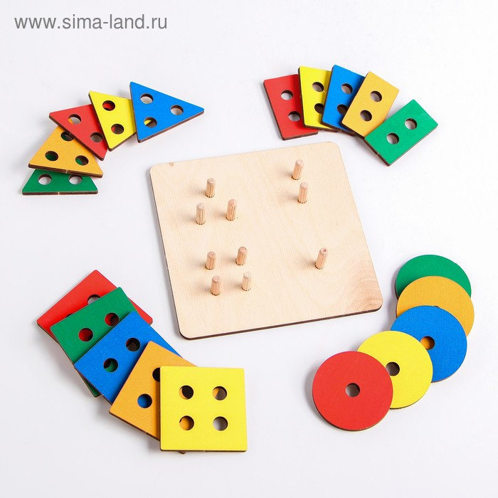 Геоборд «Геометрия» — одна из немногих дидактических игрушек, дающих возможность формировать у ребёнка комплекс необходимых интеллектуальных умений. Материал предназначен для нанизывания геометрических фигур на штырьки.
