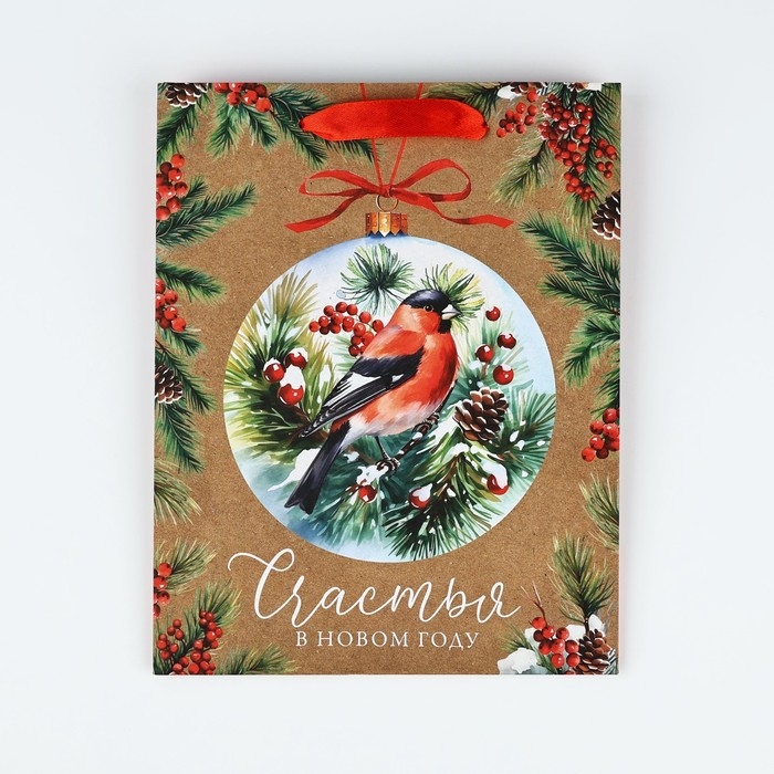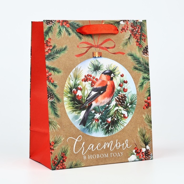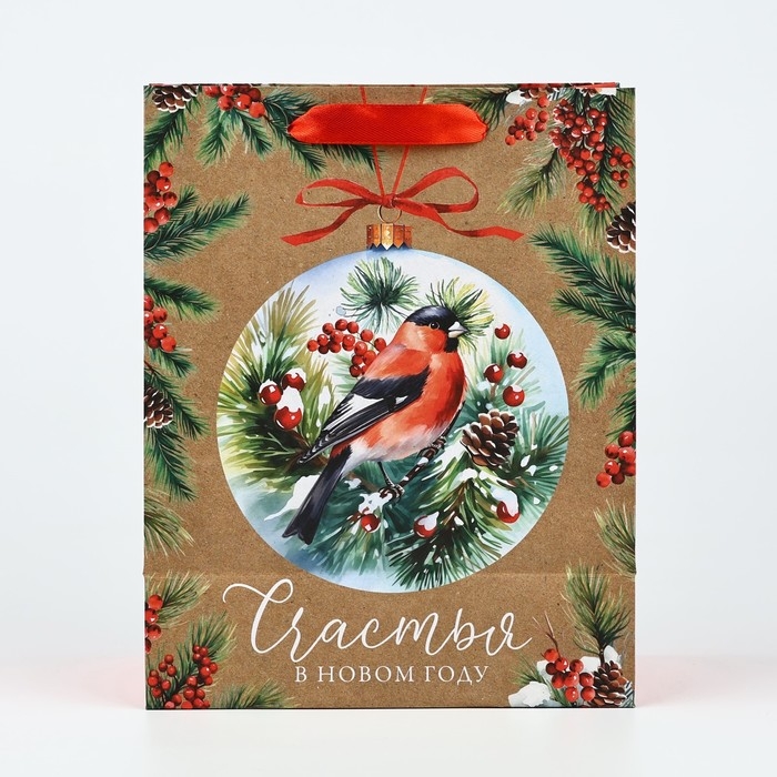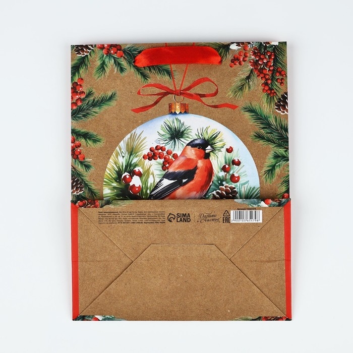 Пакет подарочный новогодний крафтовый вертикальный «Счастья в Новом году», снегирь, MS 18 х 23 х 10 см, Новый год