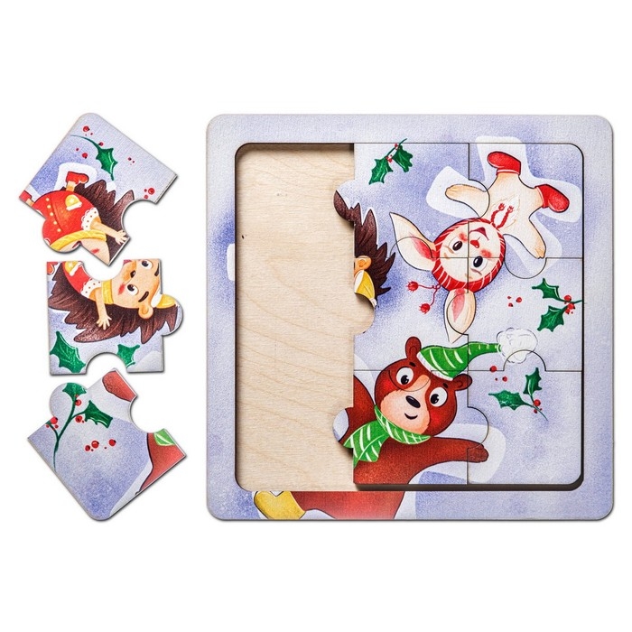 Пазл «Новогодняя прогулка» с 9 крупными деревянными деталями — идеальный первый пазл для малышей от 1 года. Яркое изображение улитки и простота сборки способствуют развитию мелкой моторики и логического мышления, предоставляя ребёнку возможность безопасно и увлекательно познакомиться с миром игрушек для сборки.