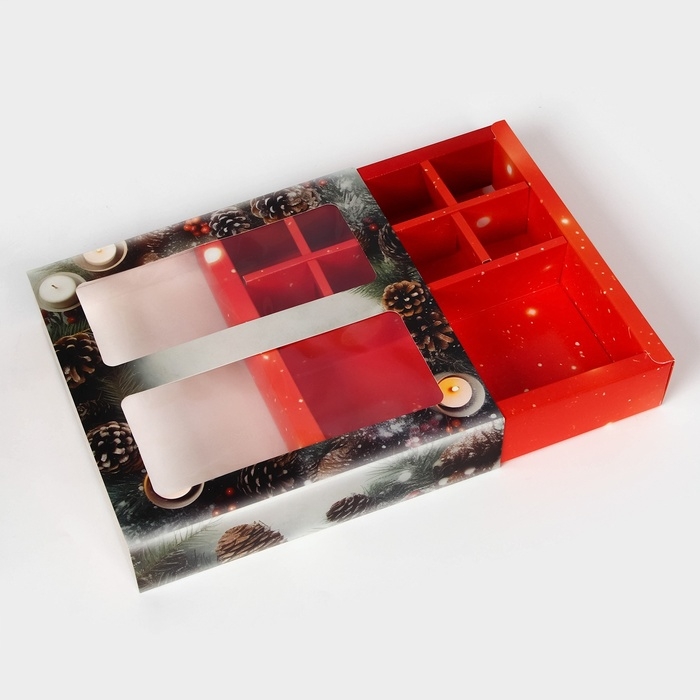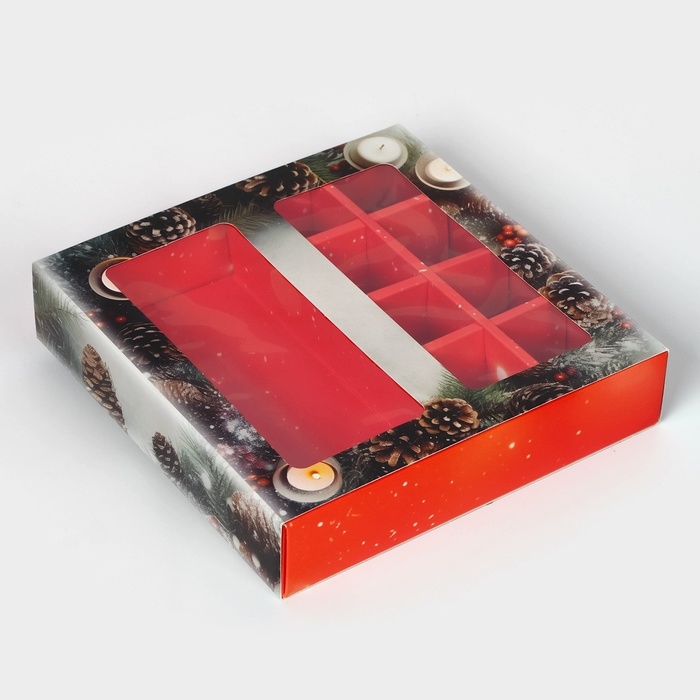 Новый год. Коробка под 8 конфет и шоколад, с окном "Новогодняя", 17,7 х 17,8 х 3,8 см, кондитерская упаковка