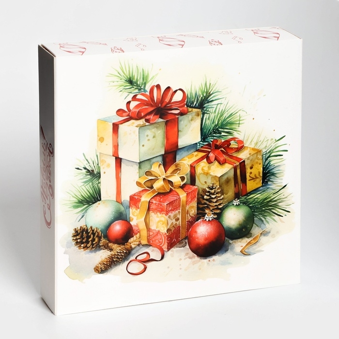 Прекрасно оформленная коробка выполнена в традиционном праздничном стиле, что придает ей волшебное зимнее очарование.