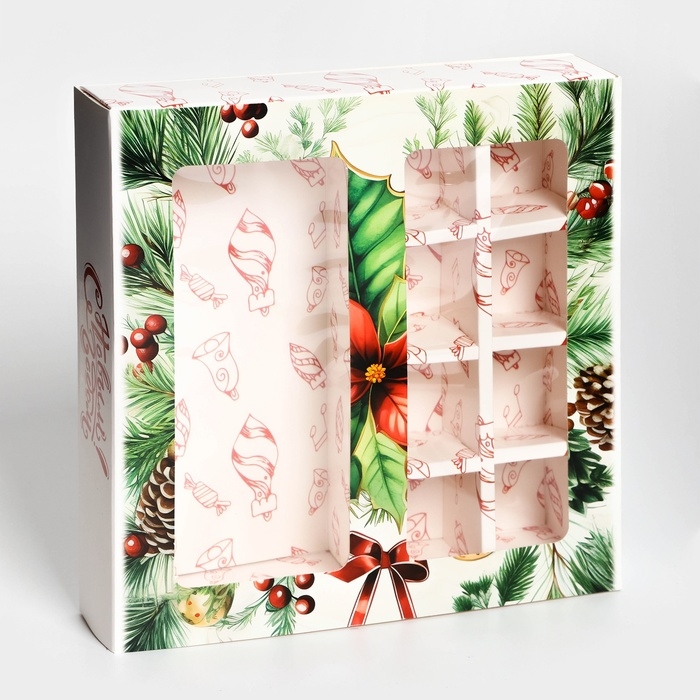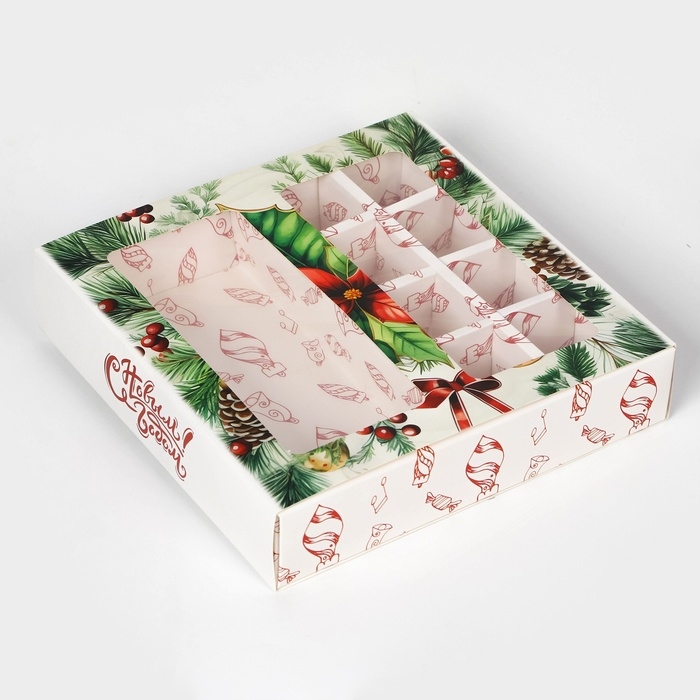 Новый год. Коробка под 8 конфет и шоколад, с окном "Новогодние подарки", 17,7 х 17,8 х 3,8 см, кондитерская упаковка