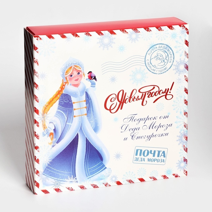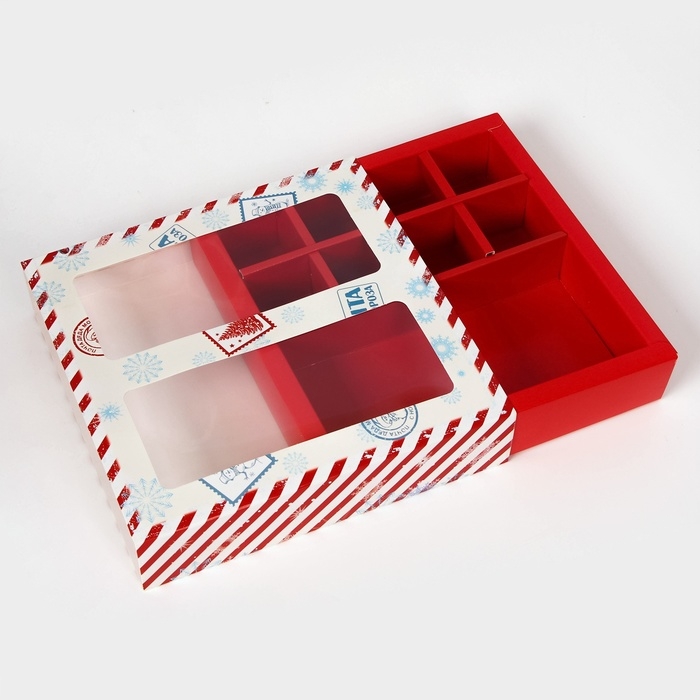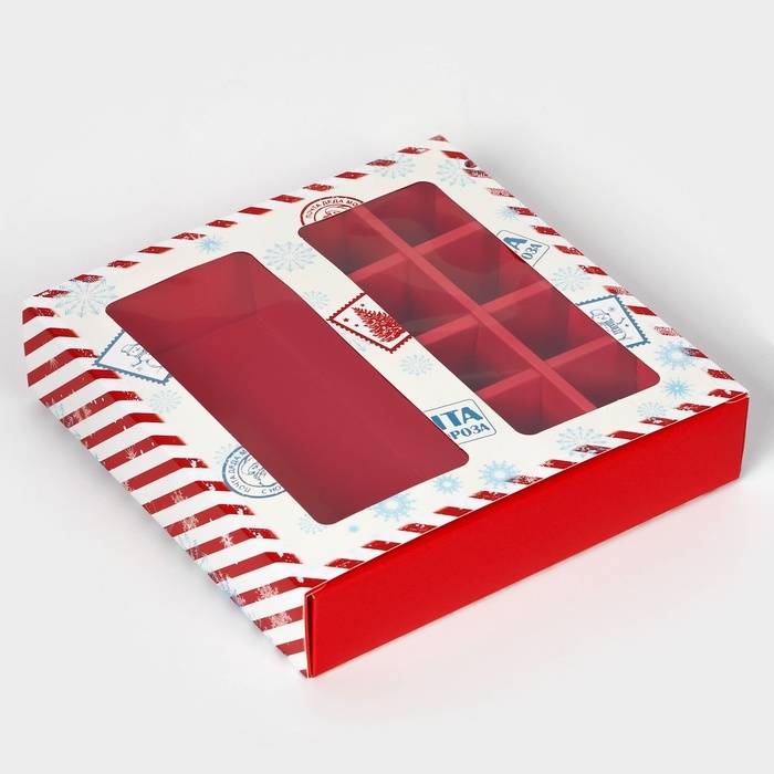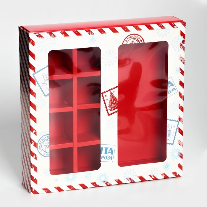 Новый год. Коробка под 8 конфет и шоколад, с окном "Новогодняя почта", 17,7 х 17,8 х 3,8 см, кондитерская упаковка