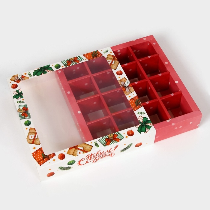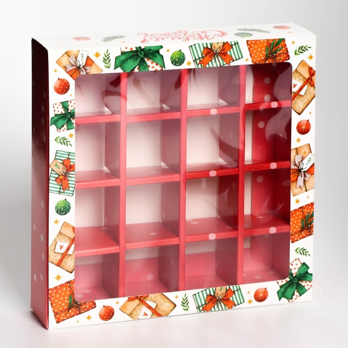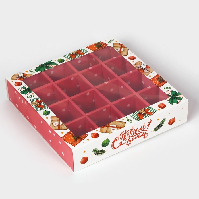 Коробка под 16 конфет "Новогодняя" размером 17,7х17,7х3,8 см - это прекрасный выбор для упаковки сладостей к празднику. Она выполнена в ярких новогодних цветах, что создает атмосферу праздника и волшебства.