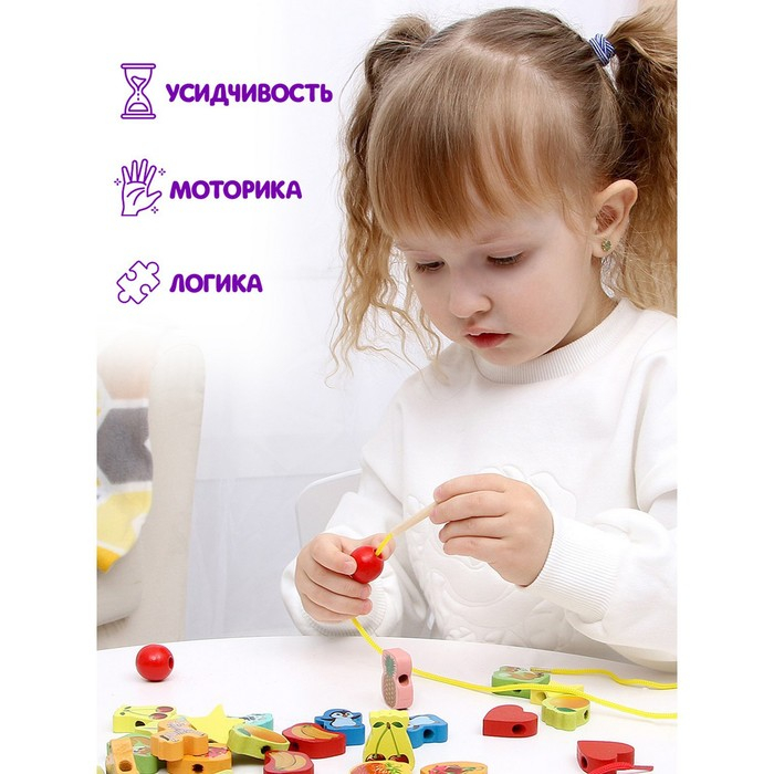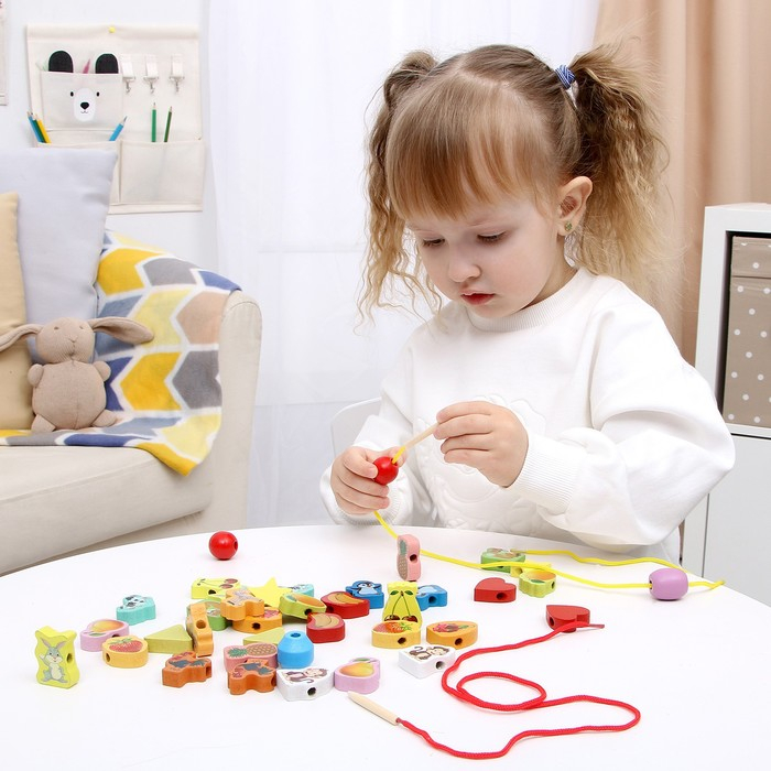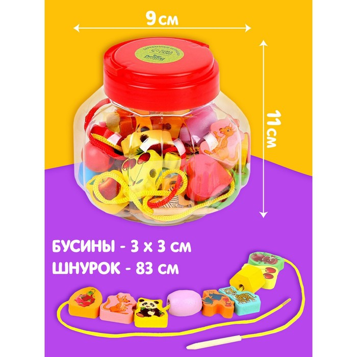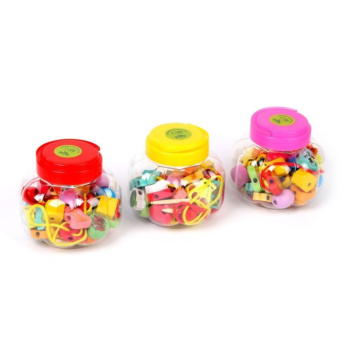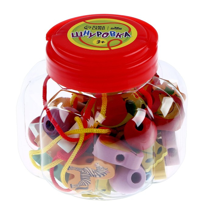 Шнуровка в банке 40 деталей "Цветы,фигуры,сердца", 2 иглы дерев , 2 шнурка, цвета МИКС, шнурок 90 см