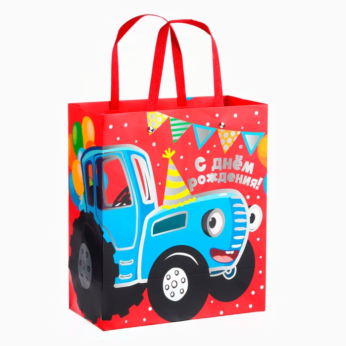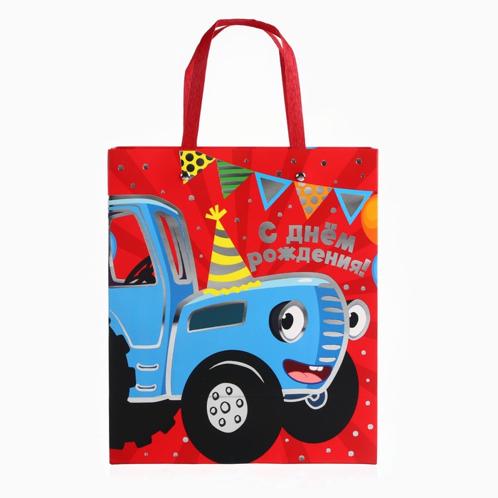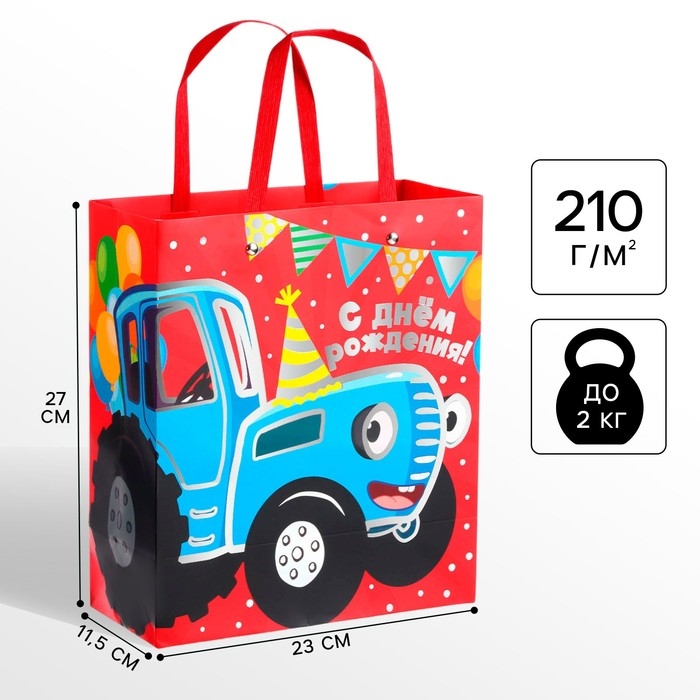 Пакет подарочный ламинированный с тиснением "С Днём Рождения!", Синий трактор, 23х27х11,5