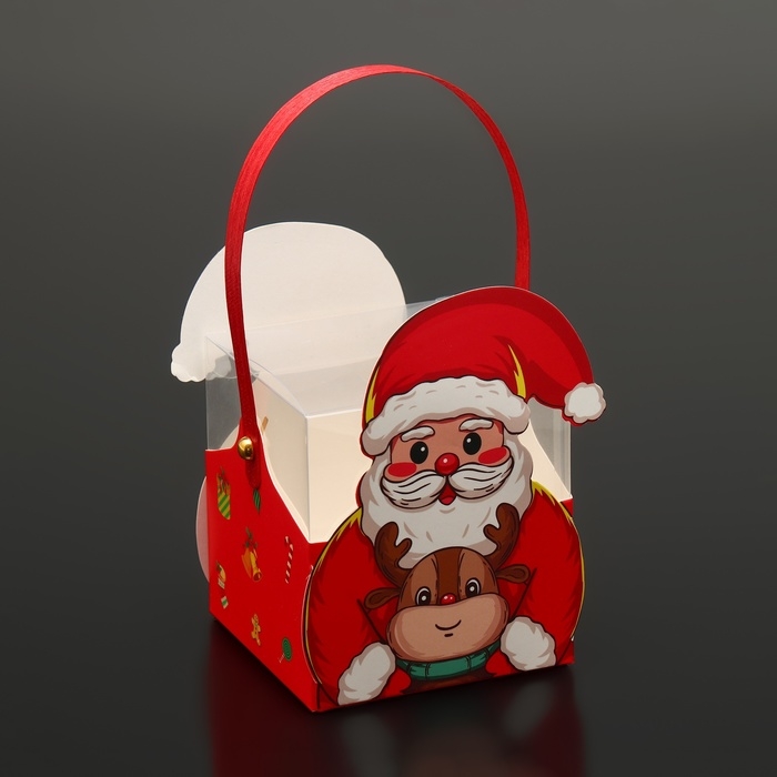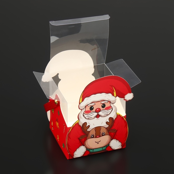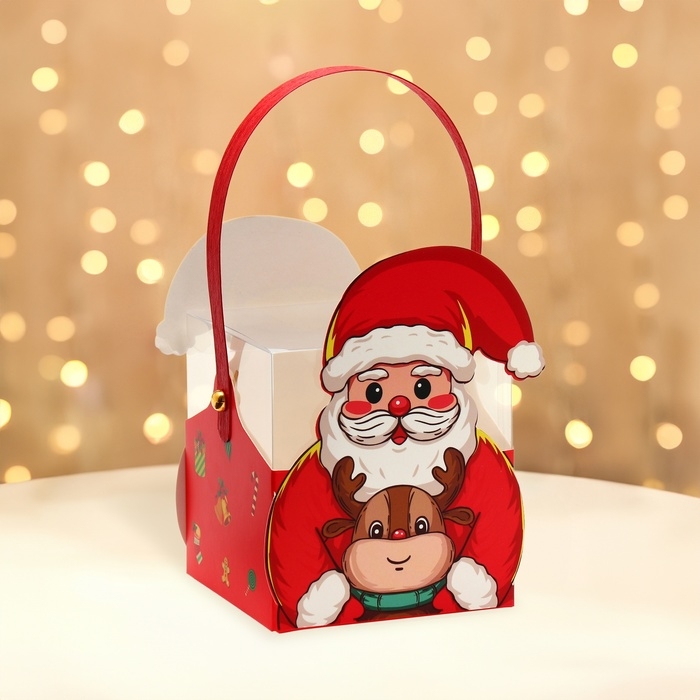 Новый год. Коробка подарочная новогодняя складная ПВХ с ручками, "Санта и подарки", 9 х 9 х 9,5 см.