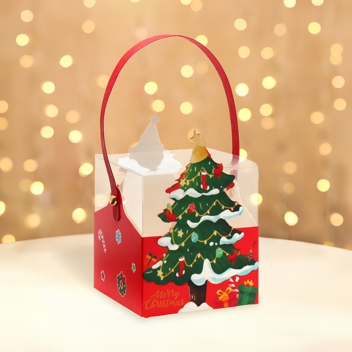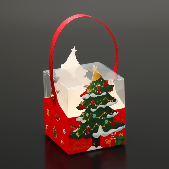 Новый год. Коробка подарочная новогодняя складная ПВХ с ручками, "Заснеженная Ёлка", 9 х 9 х 9,5 см.
