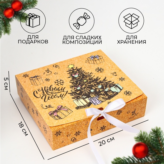 Складная подарочная коробка новогодняя с лентой, размером 20 × 18 × 5 см — это стильное и удобное решение для упаковки ваших праздничных подарков. Эта элегантная коробка с новогодним дизайном станет идеальным выбором для демонстрации ваших подарков в самые важные моменты.