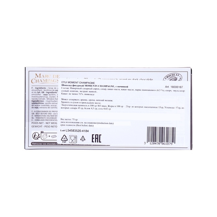 Шоколад фигурный MOMENTS CHAMPAGNE - это не просто сладость, это настоящий волшебный подарок, который принесет радость и удовольствие в самые долгожданные моменты праздничного сезона. Эти шоколадные бутылочки созданы с любовью и заботой, чтобы погрузить вас в атмосферу новогодней сказки. Нежная шоколадная фигурка с интересной начинкой словно скрывает в себе тайны вкусов и ароматов.