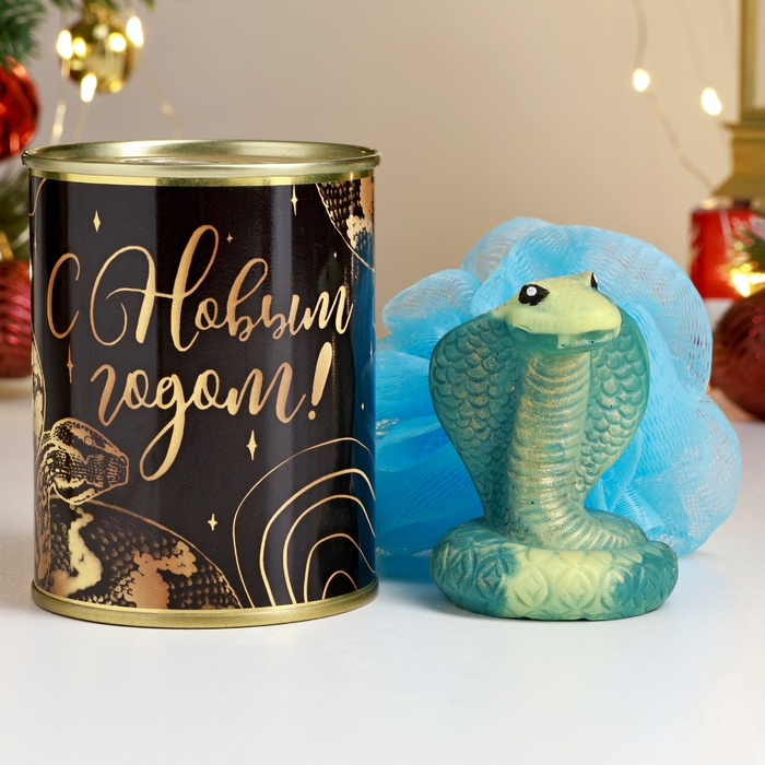 Новый год. Символ 2025. Набор в консервной банке "Золотой змей" черная, мыло + мочалка