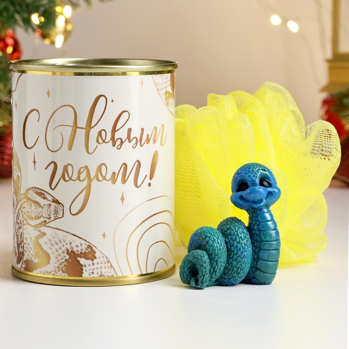 Новый год. Символ 2025. Набор в консервной банке "Золотой змей" белая, мыло + мочалка