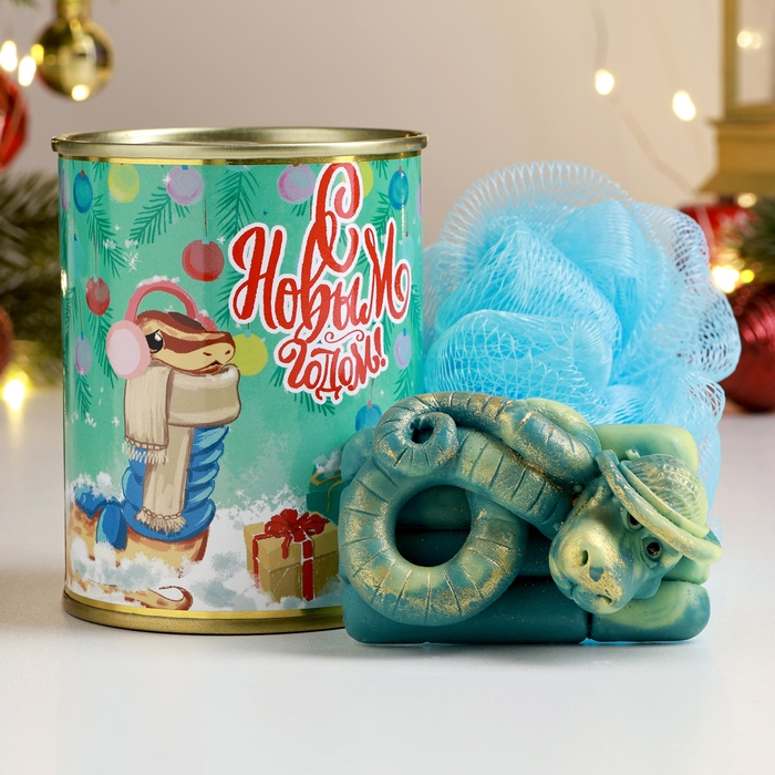 Новый год. Символ 2025. Набор в консервной банке "Теплых праздников" змея мыло + мочалка