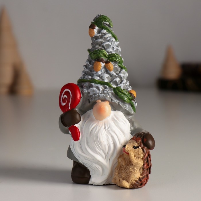 Сувенир полистоун "Гном в шапке с шишками, с ёжиком и леденцом" 5,5х4,5х10,5 см