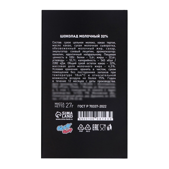 Насладитесь каждым кусочком этого волшебного шоколада, который наполняет сердце радостью и теплом. Пусть шоколад "Счастья в Новом Году!" станет незаменимой частью ваших праздников, создавая незабываемые моменты счастья и уюта!