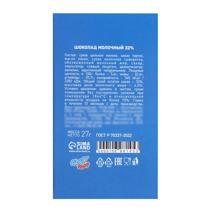 Молочный шоколад "Merry Christmas and Happy New Year" — это сладость, которая подарит вам атмосферу праздника и теплоты в самые волшебные дни года. На упаковке изображен веселый снеговик, который уже сам по себе вносит нотку радости и уютного празднования.