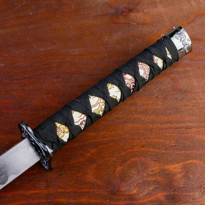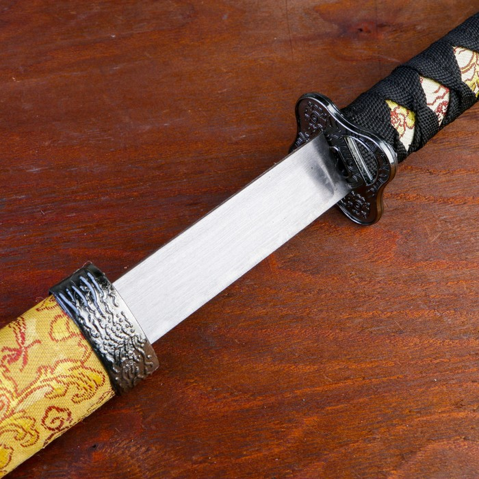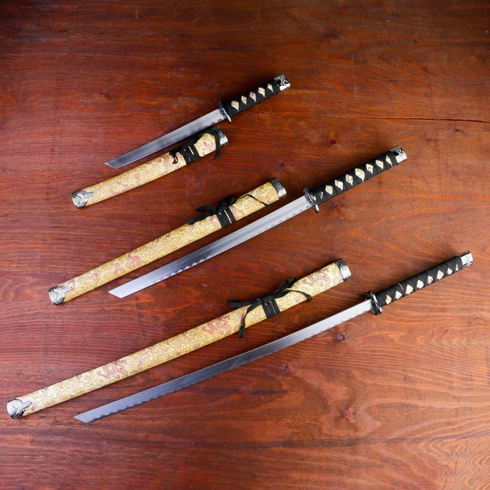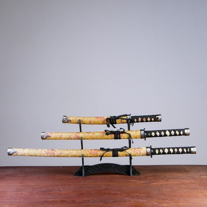 Сув. изделие катаны 3в1 на подставке, ножны ткань, драконы золото на бежевом 47/70/89см