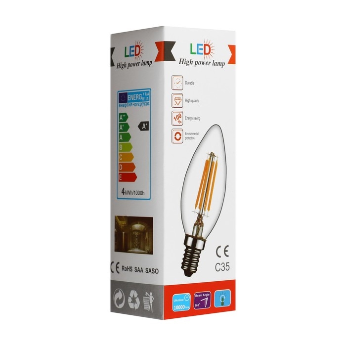 Лампа светодиодная, C37, 4 Вт, E14, 3000 К, 220 В, золотистая