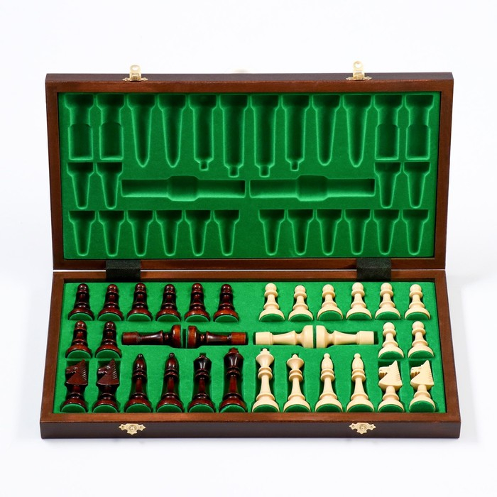 Наличие бархата зеленого цвета добавляет изыска изделию, а для удобного хранения шахматных фигур предусмотрены специальные отсеки, что обусловливает минимум передвижения при переноске.