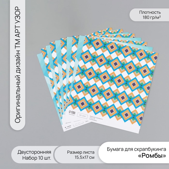 Бумага для скрапбукинга двусторонняя "Ромбы" плотность 180 гр набор 10 шт 15,5х17 см