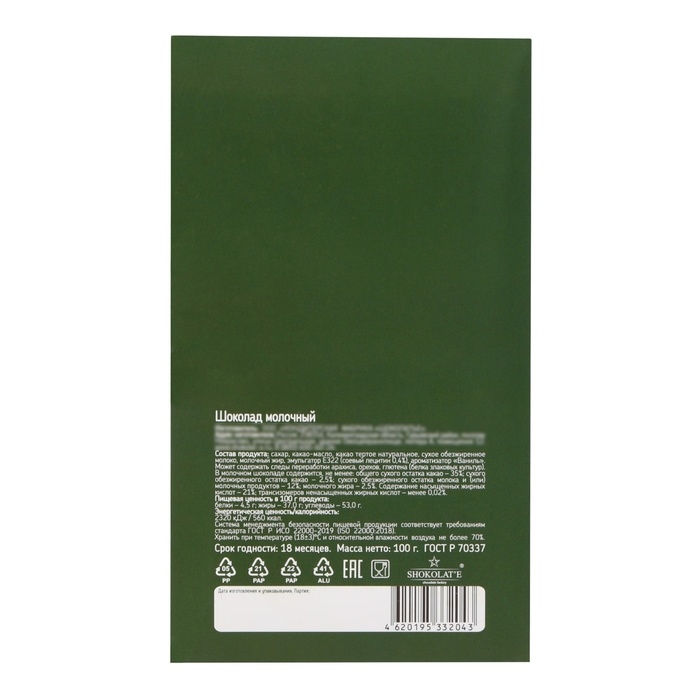 Нежный и ароматный молочный шоколад обладает утончённым вкусом, который гармонично сочетает сладость и кремовую текстуру. Каждое кусочек — это волшебство, которое растает на языке и создаст теплые воспоминания о праздниках, уютных вечерах и встречах с родными. Уникальная открытка, выполненная в зелёном цвете, символизирует и идеально подчеркивает дух Нового года.