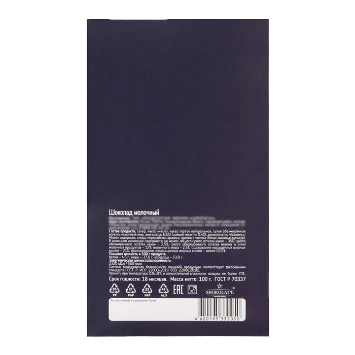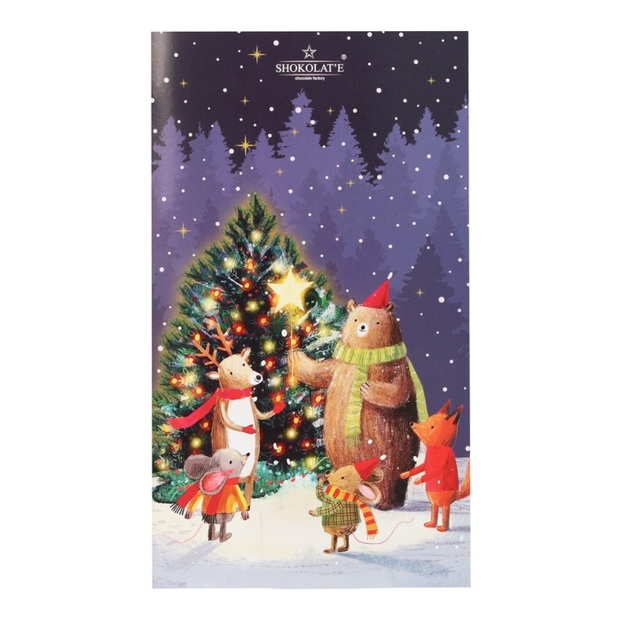 Нежный и ароматный молочный шоколад обладает утончённым вкусом, который гармонично сочетает сладость и кремовую текстуру. Каждое кусочек — это волшебство, которое растает на языке и создаст теплые воспоминания о праздниках, уютных вечерах и встречах с родными. Уникальная открытка, выполненная в синем цвете, символизирует и идеально подчеркивает дух Нового года.